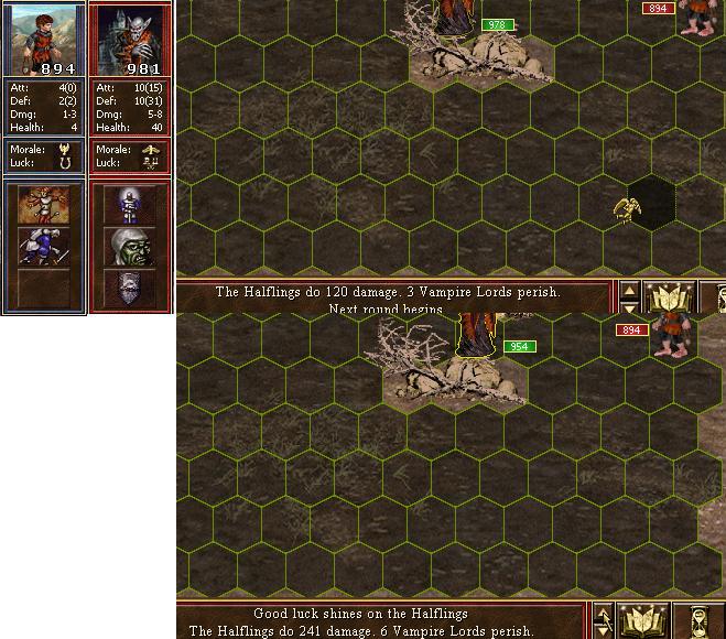 Во-вторых, удача, как известно, добавляет в итоговый урон еще один базовый (базовый урон = количество юнитов * урон одного юнита) , который для выстрела 894 хоббитов с атакой 0 по вампирам с защитой 31, составлял ровно 894 хитпоинта. Общий урон получился округленно где-то за 1100: 900 (база) - 700 (влияние разницы атаки и защиты) + 900 (удача). Половину срезал Воздушный Щит, вот и вышло 500+. Без удачи было (округленно): 900 - 700 = 200; 200 / 2 = 100. Как раз и те самые 120.