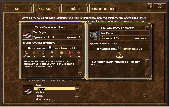 клан мертвая зона, у персонажа Murderer 2 ячейки, реальная и откуда то взявшаяся ячейка с артефактом из клана Темное братство, при попытке что-либо сделать с артефактом выдает "артефакт не найден"