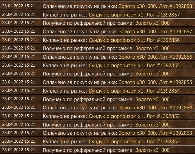 Герой Граф Владислав скупает сундуки у различных продавцов по нормальной цене 23-25к. Далее он кидает их на рынок по 30к. Герой valera111 покупает сундуки исключительно у героя Граф Владислав, тем самым финкача его. Сам же он получает реферальный "кэш бек" в 3к. Данными махинациями вышеупомянутые герои занимаются несколько месяцев, заработав этом уже миллионы.